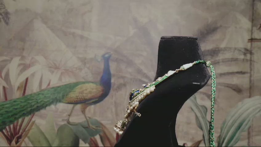 An enchanting sterling silver necklace with 18K gold plating, adorned with hand-painted green and blue enamel, kundan detailing, and elegant pearl tassels for a heritage look.